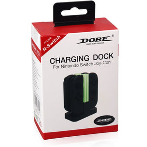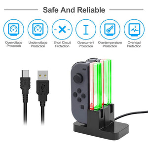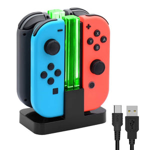 Gebruik dit charging dock om je Joy Cons op te laden, maximaal 4 stuks. Het dock wordt geleverd met een USB-C kabel, deze kun je aansluiten op je USB stekker of een andere USB-A aansluiting. De middelste transparante, acrylic bar geeft rood licht als de Joy Cons worden opgeladen. Groen als ze vol zitten of het docking station niet is aangesloten met de USB kabel.